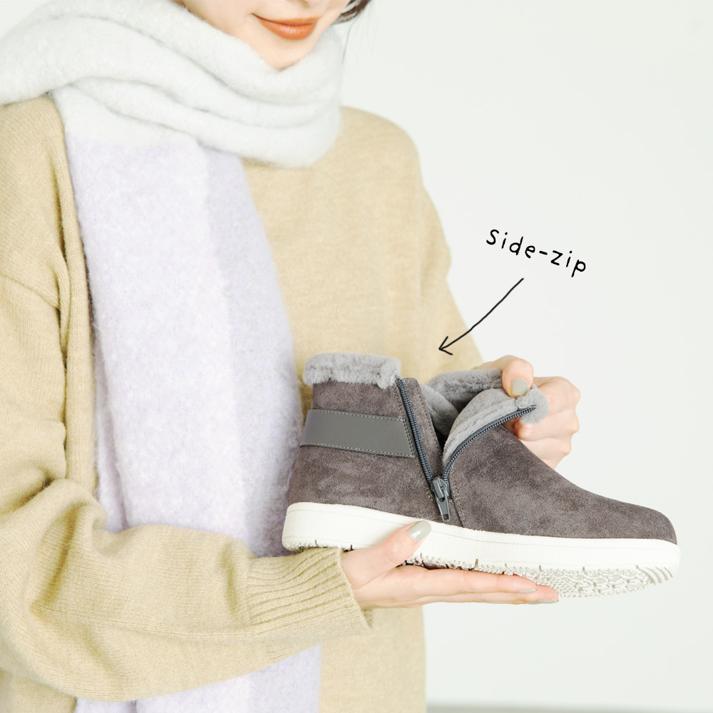 履き口やインソールのふかふかボアに、ゆったりと履ける幅広の3E設計で、暖かく快適な着用感もポイントです。